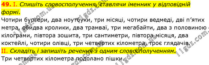 І. Спишіть словосполучення, ставлячи іменник у відповідній формі. Чотири бургери, два ноутбуки, три місяці, чотири ведмеді, дві п’ятих метра, обидва кролики, два трамваї, три мегабайти, два з половиною кілограми, півтора зошита, три сантиметри, півтора місяця, два коктейлі, чотири олівці, три четвертих кілометра, троє глядачів. II. Складіть і запишіть речення з одним словосполученням. Три четвертих кілометра подолано пішки.