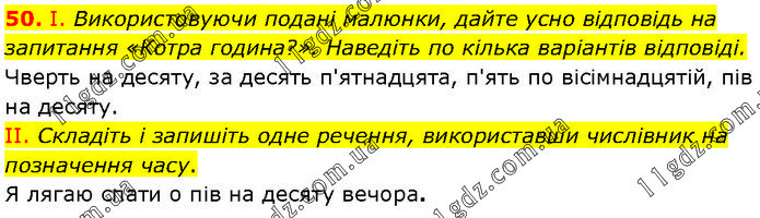 І. Використовуючи подані малюнки, дайте усно відповідь на запитання «Котра година?». Наведіть по кілька варіантів відповіді. Чверть на десяту, за десять п'ятнадцята, п'ять по вісімнадцятій, пів на десяту. II. Складіть і запишіть одне речення, використавши числівник на позначення часу. Я лягаю спати о пів на десяту вечора.