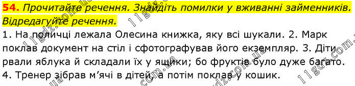 Прочитайте речення. Знайдіть помилки у вживанні займенників. Відредагуйте речення. 1. На поличці лежала Олесина книжка, яку всі шукали. 2. Марк поклав документ на стіл і сфотографував його екземпляр. 3. Діти рвали яблука й складали їх у ящики; бо фруктів було дуже багато. 4. Тренер зібрав м’ячі в дітей, а потім поклав у кошик.