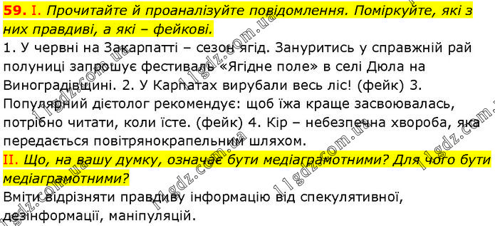І. Прочитайте й проаналізуйте повідомлення. Поміркуйте, які з них правдиві, а які – фейкові. 1. У червні на Закарпатті – сезон ягід. Зануритись у справжній рай полуниці запрошує фестиваль «Ягідне поле» в селі Дюла на Виноградівщині. 2. У Карпатах вирубали весь ліс! (фейк) 3. Популярний дієтолог рекомендує: щоб їжа краще засвоювалась, потрібно читати, коли їсте. (фейк) 4. Кір – небезпечна хвороба, яка передається повітрянокрапельним шляхом. II. Що, на вашу думку, означає бути медіаграмотними? Для чого бути медіаграмотними? Вміти відрізняти правдиву інформацію від спекулятивної, дезінформації, маніпуляцій.