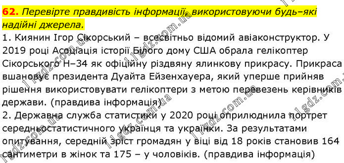 Перевірте правдивість інформації, використовуючи будь–які надійні джерела. 1. Киянин Ігор Сікорський – всесвітньо відомий авіаконструктор. У 2019 році Асоціація історії Білого дому США обрала гелікоптер Сікорського Н–34 як офіційну різдвяну ялинкову прикрасу. Прикраса вшановує президента Дуайта Ейзенхауера, який уперше прийняв рішення використовувати гелікоптери з метою перевезень керівників держави. (правдива інформація) 2. Державна служба статистики у 2020 році оприлюднила портрет середньостатистичного українця та українки. За результатами опитування, середній зріст громадян у віці від 18 років становив 164 сантиметри в жінок та 175 – у чоловіків. (правдива інформація)