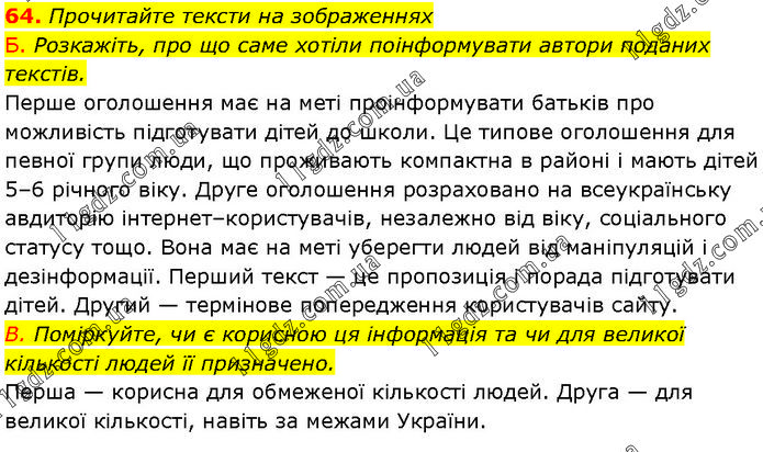 Прочитайте тексти на зображеннях Б. Розкажіть, про що саме хотіли поінформувати автори поданих текстів. Перше оголошення має на меті проінформувати батьків про можливість підготувати дітей до школи. Це типове оголошення для певної групи люди, що проживають компактна в районі і мають дітей 5–6 річного віку. Друге оголошення розраховано на всеукраїнську авдиторію інтернет–користувачів, незалежно від віку, соціального статусу тощо. Вона має на меті уберегти людей від маніпуляцій і дезінформації. Перший текст — це пропозиція і порада підготувати дітей. Другий — термінове попередження користувачів сайту. В. Поміркуйте, чи є корисною ця інформація та чи для великої кількості людей її призначено. Перша — корисна для обмеженої кількості людей. Друга — для великої кількості, навіть за межами України.
