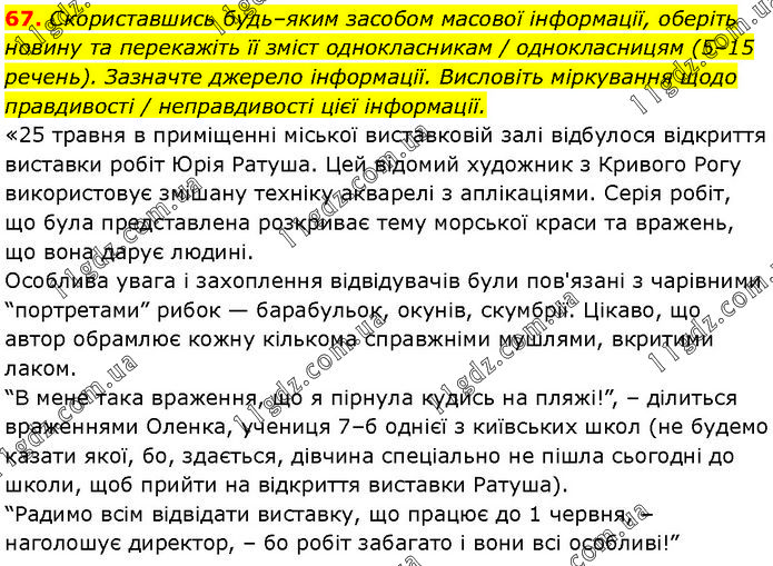 Скориставшись будь–яким засобом масової інформації, оберіть новину та перекажіть її зміст однокласникам / однокласницям (5–15 речень). Зазначте джерело інформації. Висловіть міркування щодо правдивості / неправдивості цієї інформації. «25 травня в приміщенні міської виставковій залі відбулося відкриття виставки робіт Юрія Ратуша. Цей відомий художник з Кривого Рогу використовує змішану техніку акварелі з аплікаціями. Серія робіт, що була представлена розкриває тему морської краси та вражень, що вона дарує людині. Особлива увага і захоплення відвідувачів були пов'язані з чарівними “портретами” рибок — барабульок, окунів, скумбрії. Цікаво, що автор обрамлює кожну кількома справжніми мушлями, вкритими лаком. “В мене така враження, що я пірнула кудись на пляжі!”, – ділиться враженнями Оленка, учениця 7–б однієї з київських школ (не будемо казати якої, бо, здається, дівчина спеціально не пішла сьогодні до школи, щоб прийти на відкриття виставки Ратуша). “Радимо всім відвідати виставку, що працює до 1 червня, – наголошує директор, – бо робіт забагато і вони всі особливі!”