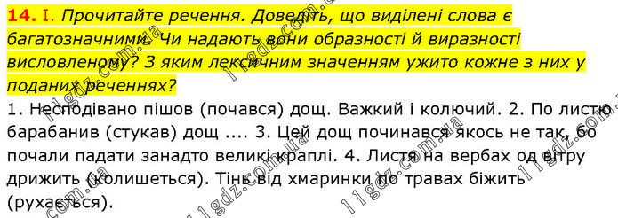 І. Прочитайте речення. Доведіть, що виділені слова є багатозначними. Чи надають вони образності й виразності висловленому? З яким лексичним значенням ужито кожне з них у поданих реченнях? 1. Несподівано пішов (почався) дощ. Важкий і колючий. 2. По листю барабанив (стукав) дощ .... 3. Цей дощ починався якось не так, бо почали падати занадто великі краплі. 4. Листя на вербах од вітру дрижить (колишеться). Тінь від хмаринки по травах біжить (рухається).