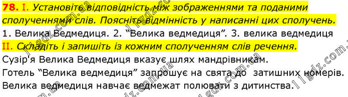 І. Установіть відповідність між зображеннями та поданими сполученнями слів. Поясніть відмінність у написанні цих сполучень. 1. Велика Ведмедиця. 2. “Велика ведмедиця”. 3. велика ведмедиця II. Складіть і запишіть із кожним сполученням слів речення. Сузір'я Велика Ведмедиця вказує шлях мандрівникам. Готель “Велика ведмедиця” запрошує на свята до затишних номерів. Велика ведмедиця навчає ведмежат полювати з дитинства.