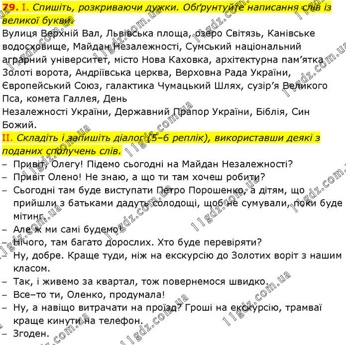 І. Спишіть, розкриваючи дужки. Обґрунтуйте написання слів із великої букви. Вулиця Верхній Вал, Львівська площа, озеро Світязь, Канівське водосховище, Майдан Незалежності, Сумський національний аграрний університет, місто Нова Каховка, архітектурна пам’ятка 3олоті ворота, Андріївська церква, Верховна Рада України, Європейський Союз, галактика Чумацький Шлях, сузір’я Великого Пса, комета Галлея, День Незалежності України, Державний Прапор України, Біблія, Син Божий. II. Складіть і запишіть діалог (5–6 реплік), використавши деякі з поданих сполучень слів. – Привіт, Олегу! Підемо сьогодні на Майдан Незалежності? – Привіт Олено! Не знаю, а що ти там хочеш робити? – Сьогодні там буде виступати Петро Порошенко, а дітям, що прийшли з батьками дадуть солодощі, щоб не сумували, поки буде мітинг. – Але ж ми самі будемо! – Нічого, там багато дорослих. Хто буде перевіряти? – Ну, добре. Краще туди, ніж на екскурсію до Золотих воріт з нашим класом. – Так, і живемо за квартал, тож повернемося швидко. – Все–то ти, Оленко, продумала! – Ну, а навіщо витрачати на проїзд? Гроші на екскурсію, трамваї краще кинути на телефон. – Згоден.