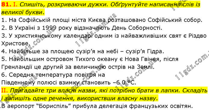 І. Спишіть, розкриваючи дужки. Обґрунтуйте написання слів із великої букви. 1. На Софійській площі міста Києва розташовано Софійський собор. 2. В Україні з 1999 року відзначають День Соборності. 3. У християнському календарі одним із найважливіших свят є Різдво Христове. 4. Найбільше за площею сузір’я на небі – сузір’я Гідра. 5. Найбільшим островом Тихого океану є Нова Гвінея, після Гренландії це другий за величиною острів на 3емлі. 6. Середня температура повітря на Південному полюсі взимку становить –6 0 °С. II. Пригадайте три власні назви, які потрібно брати в лапки. Складіть і запишіть одне речення, використвши власну назву. В аеропорт “Бориспіль” прибула делегація французьких освітян.
