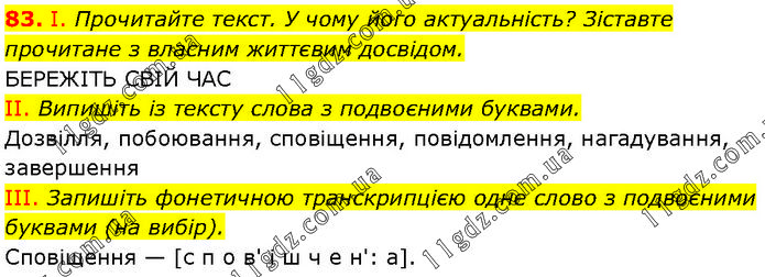 І. Прочитайте текст. У чому його актуальність? Зіставте прочитане з власним життєвим досвідом. БЕРЕЖІТЬ СВІЙ ЧАС II. Випишіть із тексту слова з подвоєними буквами. Дозвілля, побоювання, сповіщення, повідомлення, нагадування, завершення III. Запишіть фонетичною транскрипцією одне слово з подвоєними буквами (на вибір). Сповіщення — [с п о в' і ш ч е н': а].