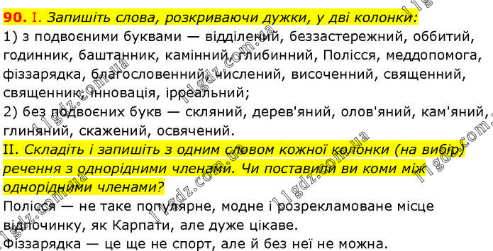 І. Запишіть слова, розкриваючи дужки, у дві колонки: 1) з подвоєними буквами — відділений, беззастережний, оббитий, годинник, баштанник, камінний, глибинний, Полісся, меддопомога, фіззарядка, благословенний, числений, височенний, священний, священник, інновація, ірреальний; 2) без подвоєних букв — скляний, дерев'яний, олов'яний, кам'яний, глиняний, скажений, освячений. II. Складіть і запишіть з одним словом кожної колонки (на вибір) речення з однорідними членами. Чи поставили ви коми між однорідними членами? Полісся — не таке популярне, модне і розрекламоване місце відпочинку, як Карпати, але дуже цікаве. Фіззарядка — це ще не спорт, але й без неї не можна.