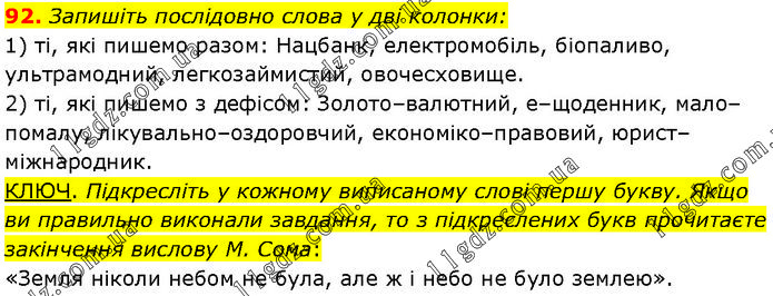 Запишіть послідовно слова у дві колонки: 1) ті, які пишемо разом: Нацбанк, електромобіль, біопаливо, ультрамодний, легкозаймистий, овочесховище. 2) ті, які пишемо з дефісом: Золото–валютний, е–щоденник, мало–помалу, лікувально–оздоровчий, економіко–правовий, юрист–міжнародник. КЛЮЧ. Підкресліть у кожному виписаному слові першу букву. Якщо ви правильно виконали завдання, то з підкреслених букв прочитаєте закінчення вислову М. Сома: «Земля ніколи небом не була, але ж і небо не було землею».