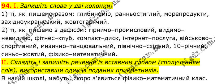 І. Запишіть слова у дві колонки: 1) ті, які пишемо разом: глибиномір, ранньостиглий, морепродукти, західноукраїнський, жовтогарячий. 2) ті, які пишемо з дефісом: гірничо–промисловий, видимо–невидимо, фітнес–клуб, компакт–диск, інтернет–послуга, військово–спортивний, мизично–танцювальний, північно–східний, 10–річний, синьо–жовтий, фізико–математичний. II. Складіть і запишіть речення із вставним словом (сполученням слів), використавши один із поданих прикметників. В нашій школі, мабуть, скоро з'явиться фізико–математичний клас.