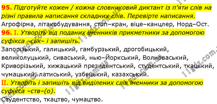 95. Підготуйте кожен / кожна словниковий диктант із п’яти слів на різні правила написання складних слів. Перевірте написання. Агрофірма, літакобудування, стоп–кран, віце–канцлер, Норд–Ост. 96. І. Утворіть від поданих іменників прикметники за допомогою суфікса –ськ– і запишіть. Запорізький, галицький, гамбурзький, дрогобицький, великолуцький, сиваський, нью–Йоркський, Волноваський, Криворізький, хижацький президентський, студентський, ткацький, чумацький, латиський, узбецький, казахський. II. Утворіть і запишіть від виділених слів іменники за допомогою суфікса –ств–(о). Студентство, ткацтво, чумацтво.