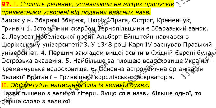 І. Спишіть речення, уставляючи на місцях пропусків прикметники утворені від поданих власних назв. Замок у м. Збаражі Збараж, Цюріх, Прага, Острог, Кременчук, Гринвіч 1. Історичним скарбом Тернопільщини є Збаразький замок. 2. Лауреат Нобелівської премії Альберт Ейнштейн навчався в Цюріхському університеті. 3. У 1348 році Карл IV заснував Празький університет. 4. Першим закладом вищої освіти в Східній Європі була Острозька академія. 5. Найбільше за площею водосховище України – Кременчуцьке водосховище. 6. Основна астрономічна організація Великої Британії – Гринвіцька королівська обсерваторія. II. Обґрунтуйте написання слів із великої букви. Назви пишемо з великої літери. Якщо слів назви більше одної, то перше слово з великої.