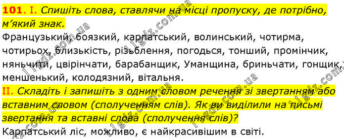 І. Спишіть слова, ставлячи на місці пропуску, де потрібно, м’який знак. Французький, боязкий, карпатський, волинський, чотирма, чотирьох, близькість, різьблення, погодься, тонший, промінчик, няньчити, цвірінчати, барабанщик, Уманщина, бриньчати, гонщик, меншенький, колодязний, вітальня. II. Складіть і запишіть з одним словом речення зі звертанням або вставним словом (сполученням слів). Як ви виділили на письмі звертання та вставні слова (сполучення слів)? Карпатський ліс, можливо, є найкрасивішим в світі.
