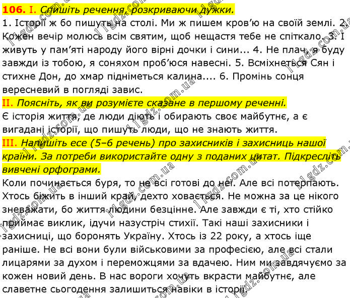 І. Спишіть речення, розкриваючи дужки. 1. Історії ж бо пишуть на столі. Ми ж пишем кров’ю на своїй землі. 2. Кожен вечір молюсь всім святим, щоб нещастя тебе не спіткало. 3. І живуть у пам’яті народу його вірні дочки і сини... 4. Не плач, я буду завжди із тобою, я соняхом проб’юся навесні. 5. Всміхнеться Сян і стихне Дон, до хмар підніметься калина.... 6. Промінь сонця вересневий в погляді завис. II. Поясніть, як ви розумієте сказане в першому реченні. Є історія життя, де люди діють і обирають своє майбутнє, а є вигадані історії, що пишуть люди, що не знають життя. III. Напишіть есе (5–6 речень) про захисників і захисниць нашої країни. За потреби використайте одну з поданих цитат. Підкресліть вивчені орфограми. Коли починається буря, то не всі готові до неї. Але всі потерпають. Хтось біжить в інший край, дехто ховається. Не можна за це нікого зневажати, бо життя людини безцінне. Але завжди є ті, хто стійко приймає виклик, ідучи назустріч стихії. Такі наші захисники і захисниці, що боронять Україну. Хтось із 22 року, а хтось іще раніше. Не всі вони були військовими за професією, але всі стали лицарями за духом і переможцями за вдачею. Ним ми завдячуємо за кожен новий день. В нас вороги хочуть вкрасти майбутнє, але славетне сьогодення залишиться навіки в історії.