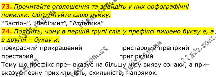 73. Прочитайте оголошення та знайдіть у них орфографічні помилки. Обґрунтуйте свою думку. “Бастіон”, “Лабіринт”, “Атлетика” 74. Поясніть, чому в першій групі слів у префіксі пишемо букву е, а в другій – букву и. прекрасний прикрашений престарий пристарілий прегіркий пригірклий Тому що префікс пре– вказує на більшу міру вияву ознаки, а при– вказує певну прихильність, схильність, напрямок.
