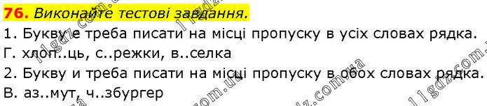 Виконайте тестові завдання. 1. Букву е треба писати на місці пропуску в усіх словах рядка. Г. хлоп..ць, с..режки, в..селка 2. Букву и треба писати на місці пропуску в обох словах рядка. В. аз..мут, ч..збургер
