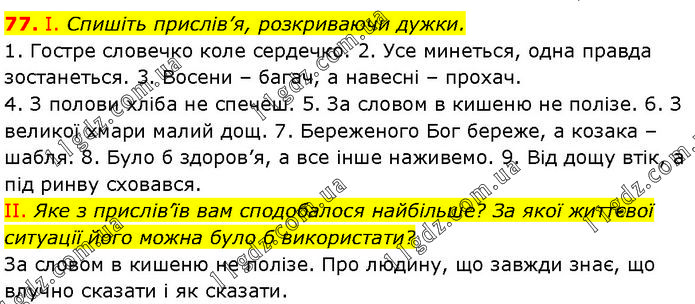 І. Спишіть прислів’я, розкриваючи дужки. 1. Гостре словечко коле сердечко. 2. Усе минеться, одна правда зостанеться. 3. Восени – багач, а навесні – прохач. 4. З полови хліба не спечеш. 5. За словом в кишеню не полізе. 6. З великої хмари малий дощ. 7. Береженого Бог береже, а козака – шабля. 8. Було б здоров’я, а все інше наживемо. 9. Від дощу втік, а під ринву сховався. II. Яке з прислів’їв вам сподобалося найбільше? За якої життєвої ситуації його можна було б використати? За словом в кишеню не полізе. Про людину, що завжди знає, що влучно сказати і як сказати.