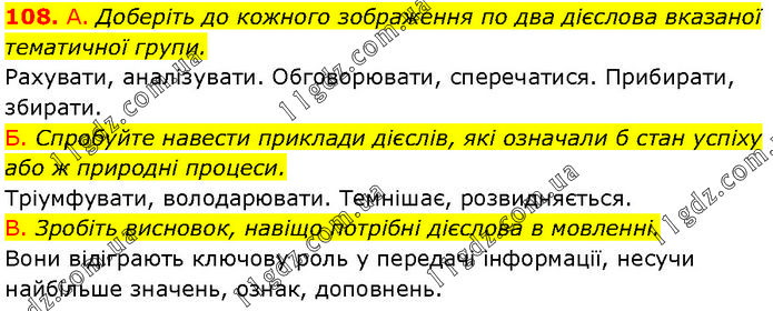 А. Доберіть до кожного зображення по два дієслова вказаної тематичної групи. Рахувати, аналізувати. Обговорювати, сперечатися. Прибирати, збирати. Б. Спробуйте навести приклади дієслів, які означали б стан успіху або ж природні процеси. Тріумфувати, володарювати. Темнішає, розвидняється. В. Зробіть висновок, навіщо потрібні дієслова в мовленні. Вони відіграють ключову роль у передачі інформації, несучи найбільше значень, ознак, доповнень.