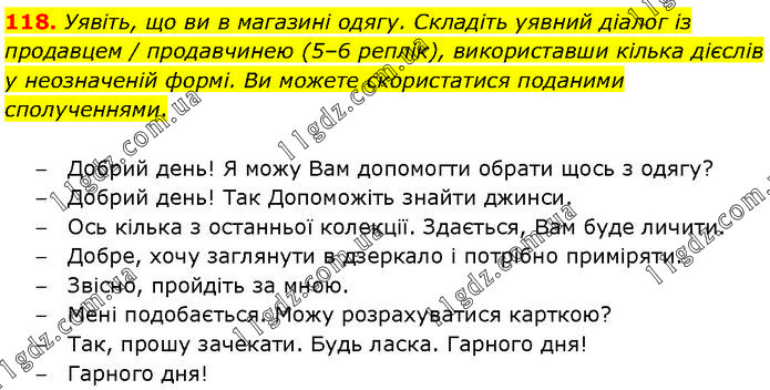 Уявіть, що ви в магазині одягу. Складіть уявний діалог із продавцем / продавчинею (5–6 реплік), використавши кілька дієслів у неозначеній формі. Ви можете скористатися поданими сполученнями. – Добрий день! Я можу Вам допомогти обрати щось з одягу? – Добрий день! Так Допоможіть знайти джинси. – Ось кілька з останньої колекції. Здається, Вам буде личити. – Добре, хочу заглянути в дзеркало і потрібно приміряти. – Звісно, пройдіть за мною. – Мені подобається. Можу розрахуватися карткою? – Так, прошу зачекати. Будь ласка. Гарного дня! – Гарного дня!