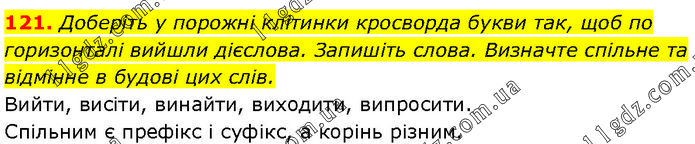 Доберіть у порожні клітинки кросворда букви так, щоб по горизонталі вийшли дієслова. Запишіть слова. Визначте спільне та відмінне в будові цих слів. Вийти, висіти, винайти, виходити, випросити. Спільним є префікс і суфікс, а корінь різним.