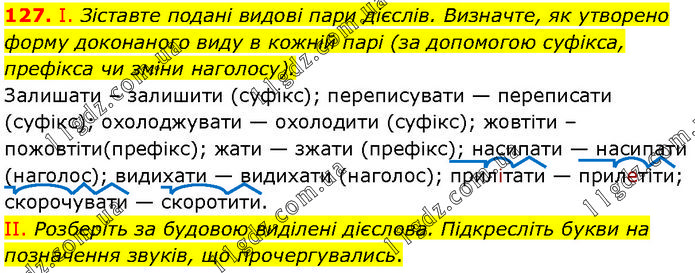 І. Зіставте подані видові пари дієслів. Визначте, як утворено форму доконаного виду в кожній парі (за допомогою суфікса, префікса чи зміни наголосу). Залишати – залишити (суфікс); переписувати — переписати (суфікс); охолоджувати — охолодити (суфікс); жовтіти – пожовтіти(префікс); жати — зжати (префікс); насипати — насипати (наголос); видихати — видихати (наголос); прилітати — прилетіти; скорочувати — скоротити. II. Розберіть за будовою виділені дієслова. Підкресліть букви на позначення звуків, що прочергувались.
