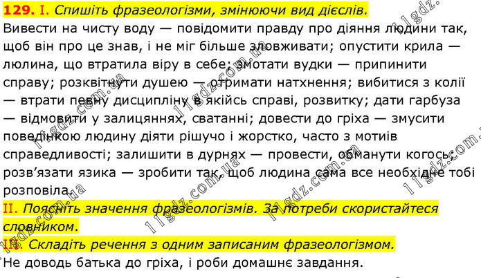 І. Спишіть фразеологізми, змінюючи вид дієслів. Вивести на чисту воду — повідомити правду про діяння людини так, щоб він про це знав, і не міг більше зловживати; опустити крила — люлина, що втратила віру в себе; змотати вудки — припинити справу; розквітнути душею — отримати натхнення; вибитися з колії — втрати певну дисципліну в якійсь справі, розвитку; дати гарбуза — відмовити у залицяннях, сватанні; довести до гріха — змусити поведінкою людину діяти рішучо і жорстко, часто з мотиів справедливості; залишити в дурнях — провести, обманути когось; розв’язати язика — зробити так, щоб людина сама все необхідне тобі розповіла. II. Поясніть значення фразеологізмів. За потреби скористайтеся словником. III. Складіть речення з одним записаним фразеологізмом. Не доводь батька до гріха, і роби домашнє завдання.