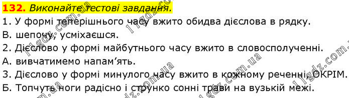 Виконайте тестові завдання. 1. У формі теперішнього часу вжито обидва дієслова в рядку. В. шепочу, усміхаєшся. 2. Дієслово у формі майбутнього часу вжито в словосполученні. А. вивчатимемо напам’ять. 3. Дієслово у формі минулого часу вжито в кожному реченні, ОКРІМ. Б. Топчуть ноги радісно і струнко сонні трави на вузькій межі.