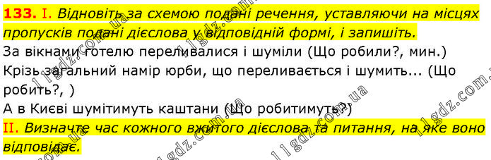 І. Відновіть за схемою подані речення, уставляючи на місцях пропусків подані дієслова у відповідній формі, і запишіть. За вікнами готелю переливалися і шуміли (Що робили?, мин.) Крізь загальний намір юрби, що переливається і шумить... (Що робить?, ) А в Києві шумітимуть каштани (Що робитимуть?) II. Визначте час кожного вжитого дієслова та питання, на яке воно відповідає.