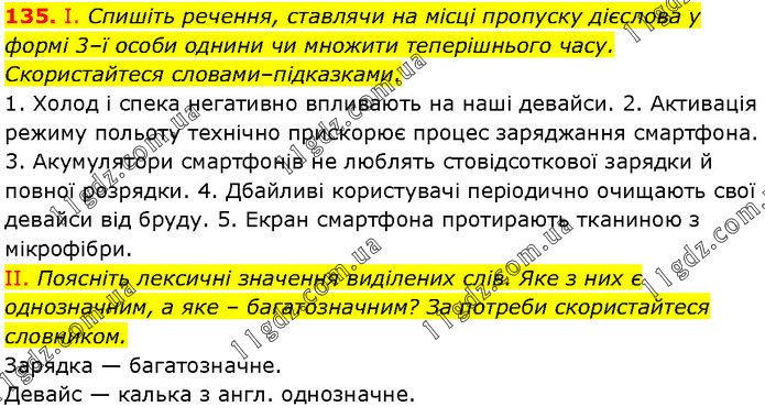 І. Спишіть речення, ставлячи на місці пропуску дієслова у формі 3–ї особи однини чи множити теперішнього часу. Скористайтеся словами–підказками. 1. Холод і спека негативно впливають на наші девайси. 2. Активація режиму польоту технічно прискорює процес заряджання смартфона. 3. Акумулятори смартфонів не люблять стовідсоткової зарядки й повної розрядки. 4. Дбайливі користувачі періодично очищають свої девайси від бруду. 5. Екран смартфона протирають тканиною з мікрофібри. II. Поясніть лексичні значення виділених слів. Яке з них є однозначним, а яке – багатозначним? За потреби скористайтеся словником. Зарядка — багатозначне. Девайс — калька з англ. однозначне.