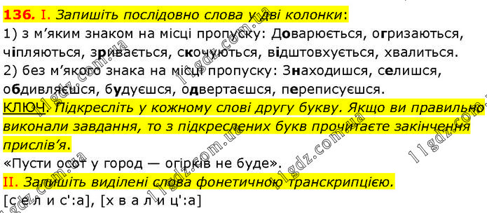 І. Запишіть послідовно слова у дві колонки: 1) з м’яким знаком на місці пропуску: Доварюється, огризаються, чіпляються, зривається, скочуються, відштовхується, хвалиться. 2) без м’якого знака на місці пропуску: Знаходишся, селишся, обдивляєшся, будуєшся, одвертаєшся, переписуєшся. КЛЮЧ. Підкресліть у кожному слові другу букву. Якщо ви правильно виконали завдання, то з підкреслених букв прочитаєте закінчення прислів’я. «Пусти осот у город — огірків не буде». II. Запишіть виділені слова фонетичною транскрипцією. [с е л и с':а], [х в а л и ц':а]