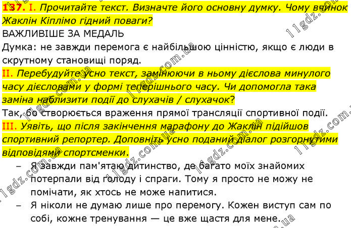 І. Прочитайте текст. Визначте його основну думку. Чому вчинок Жаклін Кіплімо гідний поваги? ВАЖЛИВІШЕ ЗА МЕДАЛЬ Думка: не завжди перемога є найбільшою цінністю, якщо є люди в скрутному становищі поряд. II. Перебудуйте усно текст, замінюючи в ньому дієслова минулого часу дієсловами у формі теперішнього часу. Чи допомогла така заміна наблизити події до слухачів / слухачок? Так, бо створюється враження прямої трансляції спортивної події. III. Уявіть, що після закінчення марафону до Жаклін підійшов спортивний репортер. Доповніть усно поданий діалог розгорнутими відповідями спортсменки. – Я завжди пам'ятаю дитинство, де багато моїх знайомих потерпали від голоду і спраги. Тому я просто не можу не помічати, як хтось не може напитися. – Я ніколи не думаю лише про перемогу. Кожен виступ сам по собі, кожне тренування — це вже щастя для мене.