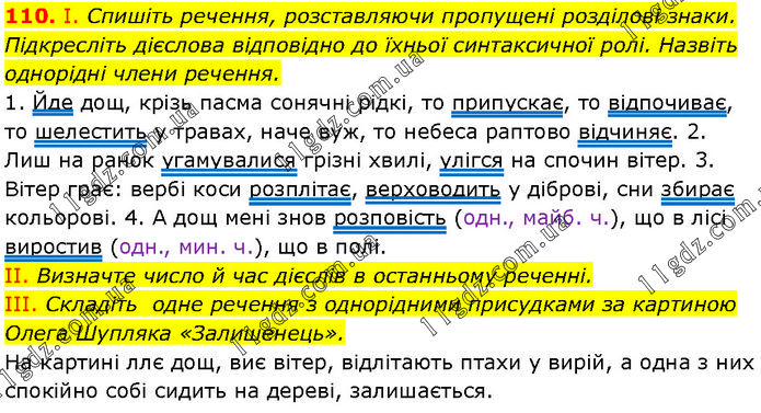 І. Спишіть речення, розставляючи пропущені розділові знаки. Підкресліть дієслова відповідно до їхньої синтаксичної ролі. Назвіть однорідні члени речення. 1. Йде дощ, крізь пасма сонячні рідкі, то припускає, то відпочиває, то шелестить у травах, наче вуж, то небеса раптово відчиняє. 2. Лиш на ранок угамувалися грізні хвилі, улігся на спочин вітер. 3. Вітер грає: вербі коси розплітає, верховодить у діброві, сни збирає кольорові. 4. А дощ мені знов розповість (одн., майб. ч.), що в лісі виростив (одн., мин. ч.), що в полі. II. Визначте число й час дієслів в останньому реченні. III. Складіть одне речення з однорідними присудками за картиною Олега Шупляка «Залишенець». На картині ллє дощ, виє вітер, відлітають птахи у вирій, а одна з них спокійно собі сидить на дереві, залишається.