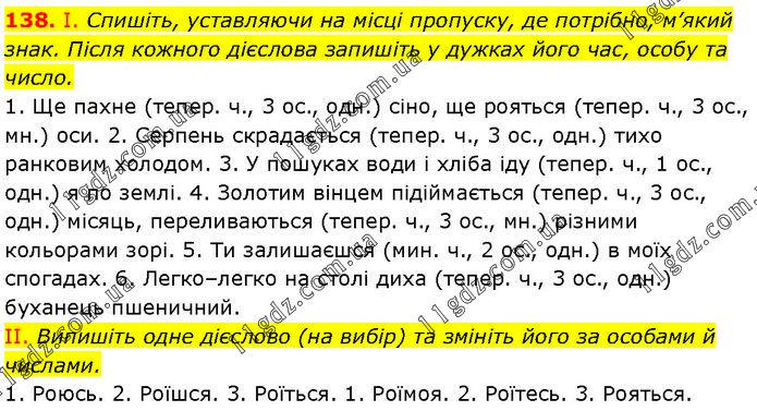І. Спишіть, уставляючи на місці пропуску, де потрібно, м’який знак. Після кожного дієслова запишіть у дужках його час, особу та число. 1. Ще пахне (тепер. ч., 3 ос., одн.) сіно, ще рояться (тепер. ч., 3 ос., мн.) оси. 2. Серпень скрадається (тепер. ч., 3 ос., одн.) тихо ранковим холодом. 3. У пошуках води і хліба іду (тепер. ч., 1 ос., одн.) я по землі. 4. Золотим вінцем підіймається (тепер. ч., 3 ос., одн.) місяць, переливаються (тепер. ч., 3 ос., мн.) різними кольорами зорі. 5. Ти залишаєшся (мин. ч., 2 ос., одн.) в моїх спогадах. 6. Легко–легко на столі диха (тепер. ч., 3 ос., одн.) буханець пшеничний. II. Випишіть одне дієслово (на вибір) та змініть його за особами й числами. 1. Роюсь. 2. Роїшся. 3. Роїться. 1. Роїмоя. 2. Роїтесь. 3. Рояться.
