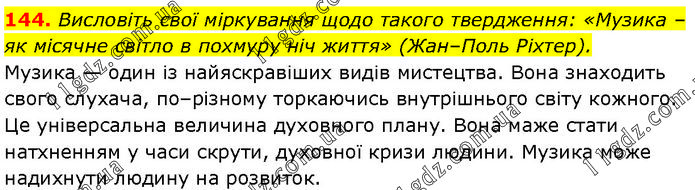 Висловіть свої міркування щодо такого твердження: «Музика – як місячне світло в похмуру ніч життя» (Жан–Поль Ріхтер). Музика — один із найяскравіших видів мистецтва. Вона знаходить свого слухача, по–різному торкаючись внутрішнього світу кожного. Це універсальна величина духовного плану. Вона маже стати натхненням у часи скрути, духовної кризи людини. Музика може надихнути людину на розвиток.