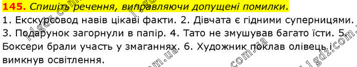 Спишіть речення, виправляючи допущені помилки. 1. Екскурсовод навів цікаві факти. 2. Дівчата є гідними суперницями. 3. Подарунок загорнули в папір. 4. Тато не змушував багато їсти. 5. Боксери брали участь у змаганнях. 6. Художник поклав олівець і вимкнув освітлення.