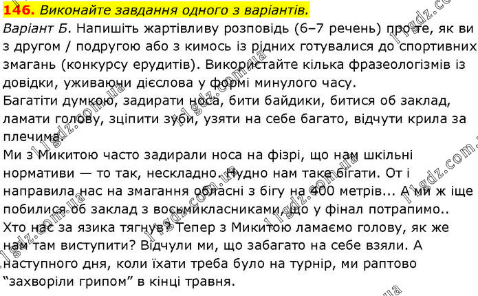 Виконайте завдання одного з варіантів. Варіант Б. Напишіть жартівливу розповідь (6–7 речень) про те, як ви з другом / подругою або з кимось із рідних готувалися до спортивних змагань (конкурсу ерудитів). Використайте кілька фразеологізмів із довідки, уживаючи дієслова у формі минулого часу. Багатіти думкою, задирати носа, бити байдики, битися об заклад, ламати голову, зціпити зуби, узяти на себе багато, відчути крила за плечима. Ми з Микитою часто задирали носа на фізрі, що нам шкільні нормативи — то так, нескладно. Нудно нам таке бігати. От і направила нас на змагання обласні з бігу на 400 метрів... А ми ж іще побилися об заклад з восьмикласниками, що у фінал потрапимо.. Хто нас за язика тягнув? Тепер з Микитою ламаємо голову, як же нам там виступити? Відчули ми, що забагато на себе взяли. А наступного дня, коли їхати треба було на турнір, ми раптово “захворіли грипом” в кінці травня.