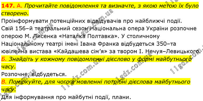 А. Прочитайте повідомлення та визначте, з якою метою їх було створено. Проінформувати потенційних відвідувачів про найближчі події. Свій 156–й театральний сезон Національна опера України розпочне оперою М. Лисенка «Наталка Полтавка». У столичному Національному театрі імені Івана Франка відбудеться 350–та ювілейна вистава «Кайдашева сім’я» за твором І. Нечуя–Левицького. Б. Знайдіть у кожному повідомленні дієслово у формі майбутнього часу. Розпочне, відбудеться. В. Поміркуйте, для чого в мовленні потрібні дієслова майбутнього часу. Для інформування про майбутні події, плани.