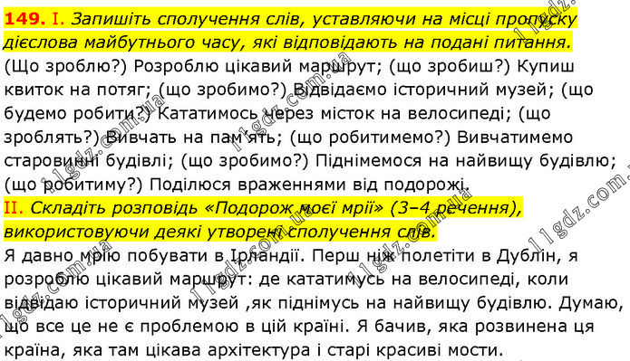 І. Запишіть сполучення слів, уставляючи на місці пропуску дієслова майбутнього часу, які відповідають на подані питання. (Що зроблю?) Розроблю цікавий маршрут; (що зробиш?) Купиш квиток на потяг; (що зробимо?) Відвідаємо історичний музей; (що будемо робити?) Кататимось через місток на велосипеді; (що зроблять?) Вивчать на пам’ять; (що робитимемо?) Вивчатимемо старовинні будівлі; (що зробимо?) Піднімемося на найвищу будівлю; (що робитиму?) Поділюся враженнями від подорожі. ІІ. Складіть розповідь «Подорож моєї мрії» (3–4 речення), використовуючи деякі утворені сполучення слів. Я давно мрію побувати в Ірландії. Перш ніж полетіти в Дублін, я розроблю цікавий маршрут: де кататимусь на велосипеді, коли відвідаю історичний музей ,як піднімусь на найвищу будівлю. Думаю, що все це не є проблемою в цій країні. Я бачив, яка розвинена ця країна, яка там цікава архітектура і старі красиві мости.