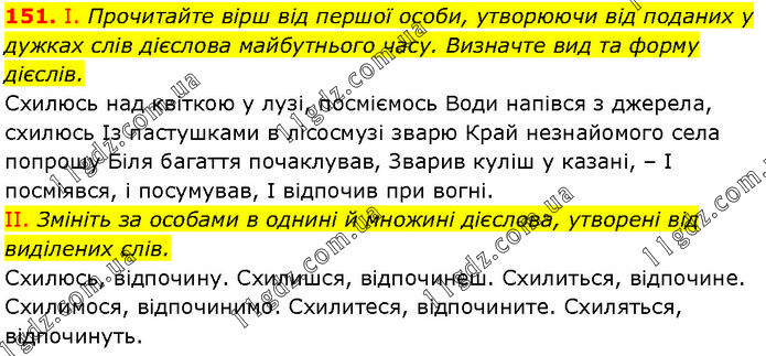 І. Прочитайте вірш від першої особи, утворюючи від поданих у дужках слів дієслова майбутнього часу. Визначте вид та форму дієслів. Схилюсь над квіткою у лузі, посміємось Води напівся з джерела, схилюсь Із пастушками в лісосмузі зварю Край незнайомого села попрошу Біля багаття почаклував, Зварив куліш у казані, – І посміявся, і посумував, І відпочив при вогні. II. Змініть за особами в однині й множині дієслова, утворені від виділених слів. Схилюсь, відпочину. Схилишся, відпочинеш. Схилиться, відпочине. Схилимося, відпочинимо. Схилитеся, відпочините. Схиляться, відпочинуть.
