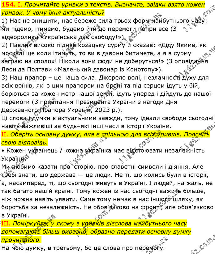 І. Прочитайте уривки з текстів. Визначте, звідки взято кожен уривок. У чому їхня актуальність? 1) Нас не знищити, нас береже сила трьох форм майбутнього часу: ми підемо, ітимемо, будемо йти до перемоги попри все (З відеоролика «Українська дає свободу!»). 2) Павлик високо підняв козацьку сурму й сказав: «Діду Якиме, як москалі ще коли ітимуть, то ви в дзвони битимете, а я в сурму заграю на сполох! Ніколи вони сюди не доберуться!» (З оповідання Леоніда Полтави «Маленький дзвонар із Конотопу»). 3) Наш прапор – це наша сила. Джерело волі, незламності духу для всіх воїнів, які з цим прапором на броні та під серцем ідуть у бій, борються за кожен метр нашої землі, ідуть уперед і дійдуть до нашої перемоги (3 привітання Президента України з нагоди Дня Державного Прапора України, 2023 р.). Ці слова і думки є актуальними завжди, тому ідеали свободи сьогодні навіть важливіші за будь–які інші часи в історії України. II. Оберіть основну думку, яка є спільною для всіх уривків. Поясніть свою відповідь. • Кожен українець / кожна українка має відстоювати незалежність України. Ми любимо казати про історію, про славетні символи і діяння. Але требі знати, що держава — це люди. Не ті, що колись були в історії, а, насамперед, ті, що сьогодні живуть в Україні. І людей, на жаль, не так багато нашій країні. Тому кожен із нас сьогодні важить більше, ніж можна навіть уявити. Саме тому немає в нас іншого шляху, як боротьба за незалежність. Не обов'язково на фронті, але обов'язково в Україні. III. Поміркуйте, у якому з уривків дієслова майбутнього часу допомагають більш виразно, образно передати основну думку прочитаного. На мою думку, в третьому, бо це слова про перемогу.
