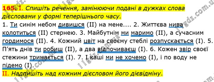 І. Спишіть речення, замінюючи подані в дужках слова дієсловами у формі теперішнього часу. 1. Ти синім небом дивишся (ІІ) на мене.... 2. Життєва нива колотиться (ІІ) стернею. 3. Майбутнім ми маримо (ІІ), а сучасним гордимося (ІІ). 4. Кожний цвіт на своєму стеблі розпускається (І). 5. П’ять днів ти робиш (ІІ), а два відпочиваєш (І). 6. Кожен звір своєї стежини тримається (І). 7. І каші ми не хочемо (І), і по воду не підемо (І). II. Надпишіть над кожним дієсловом його дієвідміну.