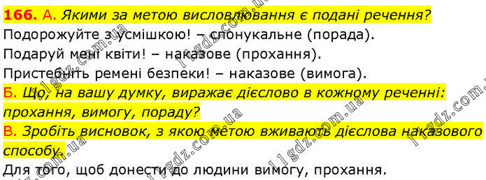 А. Якими за метою висловлювання є подані речення? Подорожуйте з усмішкою! – спонукальне (порада). Подаруй мені квіти! – наказове (прохання). Пристебніть ремені безпеки! – наказове (вимога). Б. Що, на вашу думку, виражає дієслово в кожному реченні: прохання, вимогу, пораду? В. Зробіть висновок, з якою метою вживають дієслова наказового способу. Для того, щоб донести до людини вимогу, прохання.