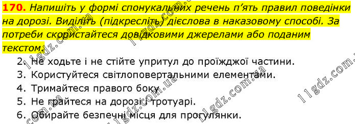 Напишіть у формі спонукальних речень п’ять правил поведінки на дорозі. Виділіть (підкресліть) дієслова в наказовому способі. За потреби скористайтеся довідковими джерелами або поданим текстом. 2. Не ходьте і не стійте упритул до проїжджої частини. 3. Користуйтеся світлоповертальними елементами. 4. Тримайтеся правого боку 5. Не грайтеся на дорозі і тротуарі. 6. Обирайте безпечні місця для прогулянки.