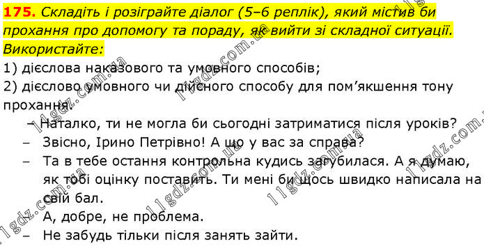 Складіть і розіграйте діалог (5–6 реплік), який містив би прохання про допомогу та пораду, як вийти зі складної ситуації. Використайте: 1) дієслова наказового та умовного способів; 2) дієслово умовного чи дійсного способу для пом’якшення тону прохання. – Наталко, ти не могла би сьогодні затриматися після уроків? – Звісно, Ірино Петрівно! А що у вас за справа? – Та в тебе остання контрольна кудись загубилася. А я думаю, як тобі оцінку поставить. Ти мені би щось швидко написала на свій бал. – А, добре, не проблема. – Не забудь тільки після занять зайти.
