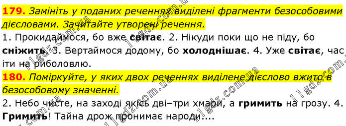 179. Замініть у поданих реченнях виділені фрагменти безособовими дієсловами. Зачитайте утворені речення. 1. Прокидаймося, бо вже світає. 2. Нікуди поки що не піду, бо сніжить. 3. Вертаймося додому, бо холоднішає. 4. Уже світає, час іти на риболовлю. 180. Поміркуйте, у яких двох реченнях виділене дієслово вжито в безособовому значенні. 2. Небо чисте, на заході якісь дві–три хмари, а гримить на грозу. 4. Гримить! Тайна дрож пронимає народи....