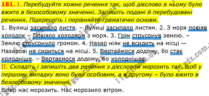 І. Перебудуйте кожне речення так, щоб дієслово в ньому було вжито в безособовому значенні. Запишіть подані й перебудовані речення. Підкресліть і порівняйте граматичні основи. 1. Вулиці засипало листя. – Вулиці засипало листям. 2. З моря повіяв холодок – Повіяло холодком з моря. 3. Грім струсонув землю. – Землю струсонуло громом. 4. Назар ніяк не всидить на місці — Назарові не сидиться на місці. 5. Вертаймося додому, бо стає холодніше. – Вертаємося додому, бо холоднішає. II. Складіть і запишіть два речення з дієсловом морозить так, щоб у першому випадку воно було особовим, а в другому – було вжито в безособовому значенні. Вітер нас морозить. Нас морозило вітром.