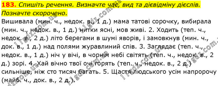 Спишіть речення. Визначте час, вид та дієвідміну дієслів. Позначте скорочено. Вишивала (мин. ч., недок. в., 1 д.) мама татові сорочку, вибирала (мин. ч., недок. в., 1 д.) нитки ясні, мов живі. 2. Ходить (теп. ч., недок. в., 2 д.) літо берегами в шумі яворів, і замовкнув (мин. ч., док. в., 1 д.) над полями журавлиний спів. 3. Заглядає (теп. ч., недок. в., 1 д.) ніч у вічі, в чорнім небі світять (теп. ч., недок. в., 2 д.) зорі. 4. Хай вічно твої очі горять (теп. ч., недок. в., 2 д.) сильніше, ніж сто тисяч багать. 5. Щастя людського усім напророчу (майб. ч., док. в., 2 д.).