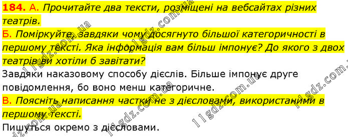 А. Прочитайте два тексти, розміщені на вебсайтах різних театрів. Б. Поміркуйте, завдяки чому досягнуто більшої категоричності в першому тексті. Яка інформація вам більш імпонує? До якого з двох театрів ви хотіли б завітати? Завдяки наказовому способу дієслів. Більше імпонує друге повідомлення, бо воно менш категоричне. В. Поясніть написання частки не з дієсловами, використаними в першому тексті. Пишуться окремо з дієсловами.