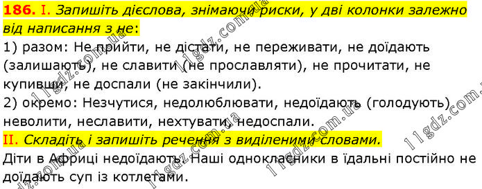 І. Запишіть дієслова, знімаючи риски, у дві колонки залежно від написання з не: 1) разом: Не прийти, не дістати, не переживати, не доїдають (залишають), не славити (не прославляти), не прочитати, не купивши, не доспали (не закінчили). 2) окремо: Незчутися, недолюблювати, недоїдають (голодують) неволити, неславити, нехтувати, недоспали. II. Складіть і запишіть речення з виділеними словами. Діти в Африці недоїдають. Наші однокласники в їдальні постійно не доїдають суп із котлетами.